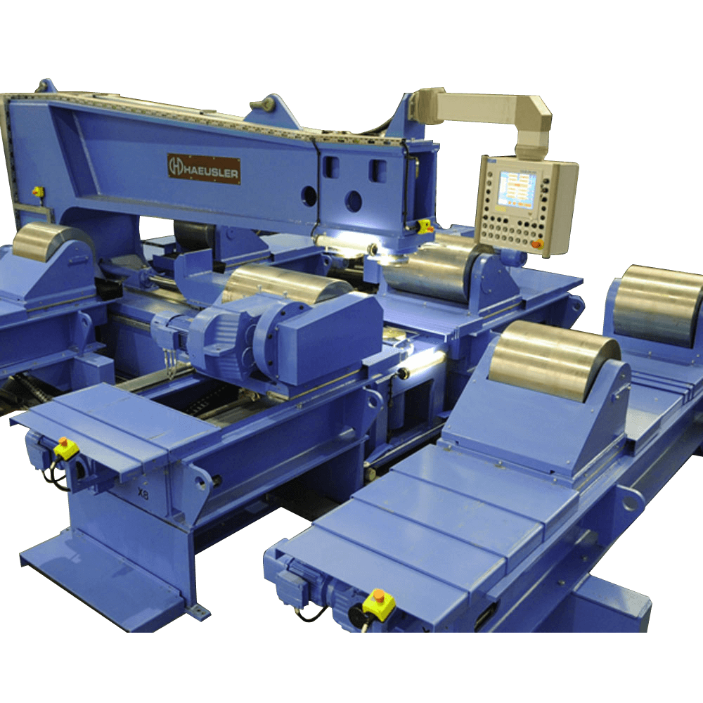 The HAEUSLER Crocodile can be classified as a mobile work centre which, when assembling cylinders, enters one cylinder at a time, positions it correctly with the help of individually adjustable rotating rollers and then welds it over its entire circumference. Due to the very simple positioning and clamping of the cylinders, time savings of up to 85% can be achieved compared to the manual process.