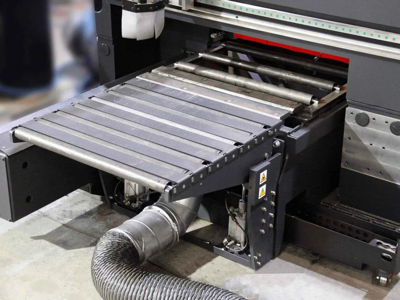 Automatic extraction system of processed parts through a folding flap. It can also be connected with an extraction belt into a sorting and storage area.